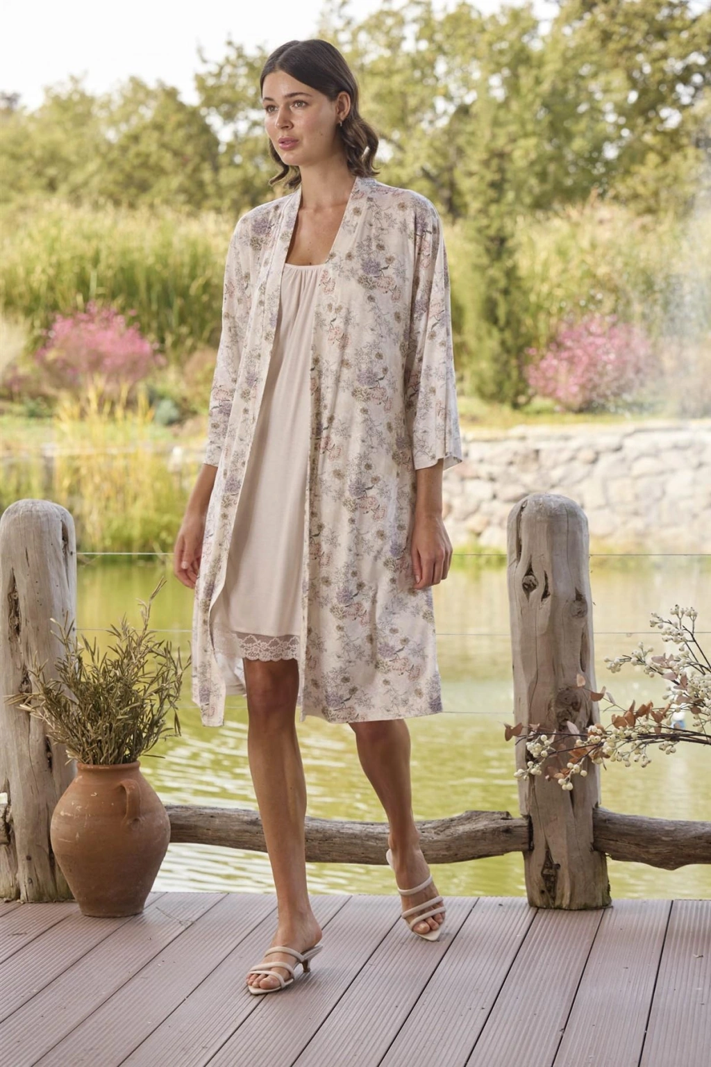 Sabahlık: Pembe zemin üzerine çiçek desenlidir, 3/4 kolludur, kuşaklıdır, örme kumaştır.