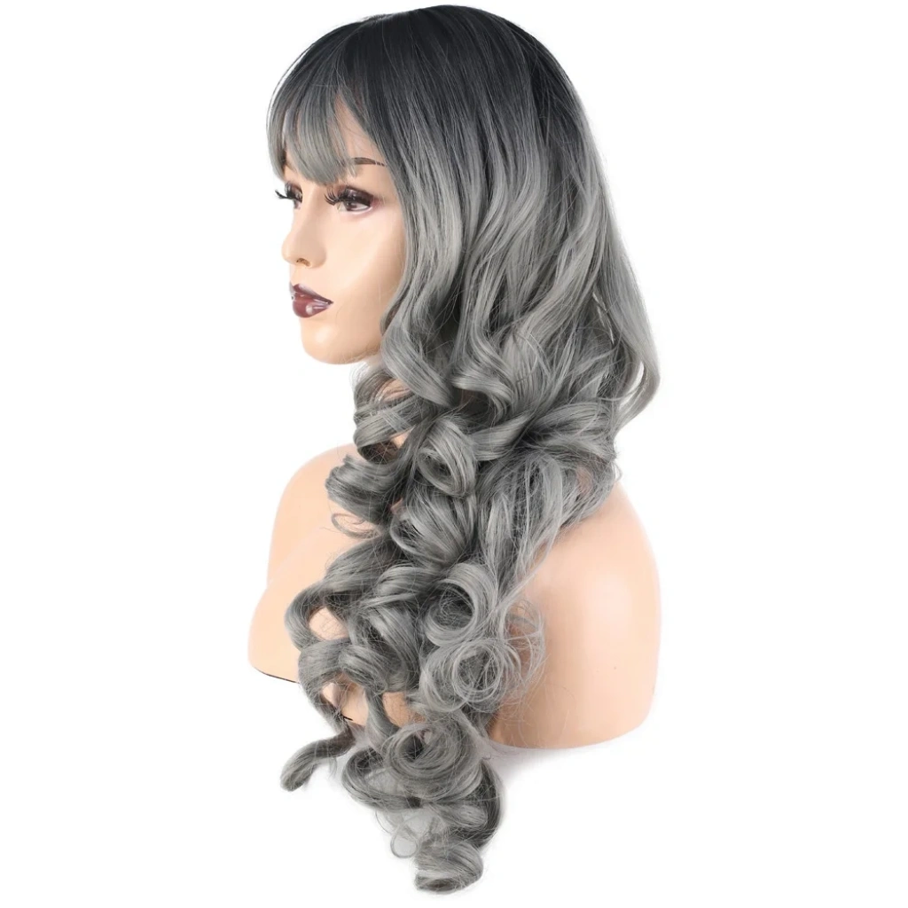 Dalgalı Perçemli Uzun Fiber Sentetik Peruk - Siyah / Gri Ombreli