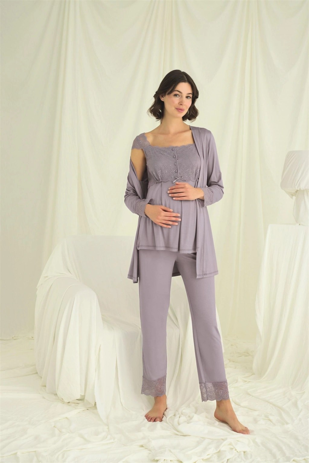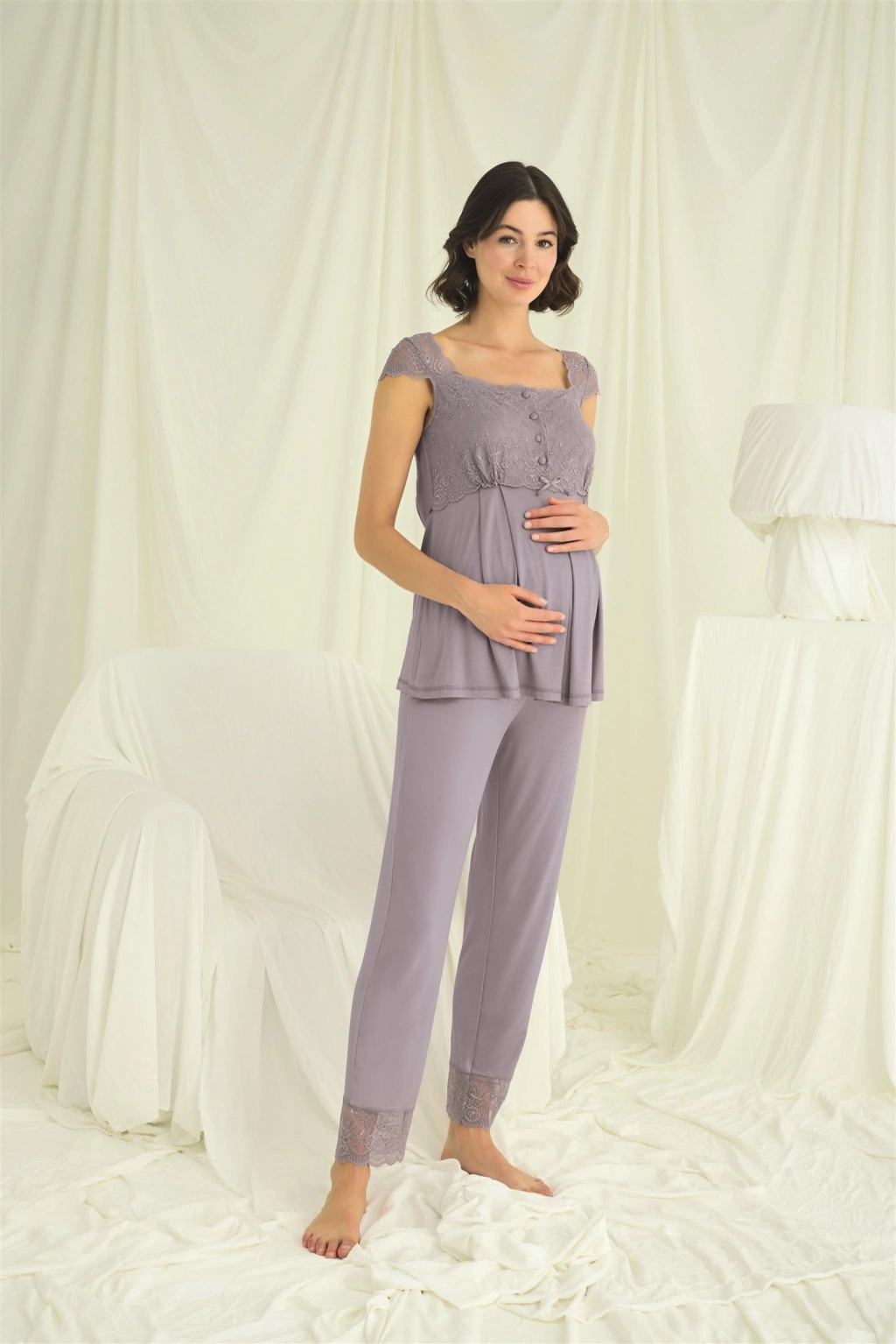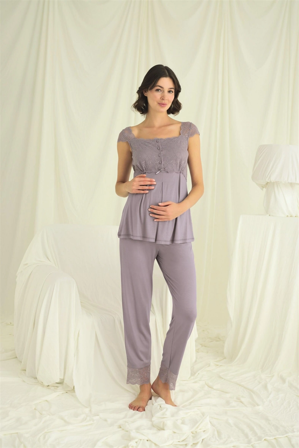 Üst: Gri renklidir, kare yakalıdır, kısa kolludur, kolu, omzu ve yakası dantellidir, yakasının altı düğmelidir, emzirme için düğmelerden açılır durumdadır, örme kumaştır.