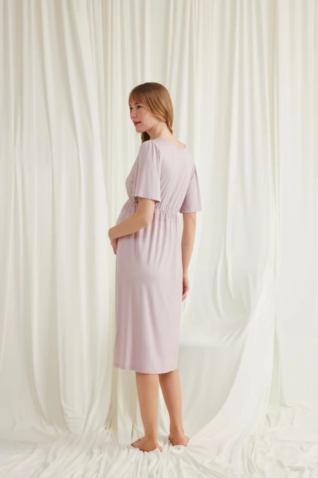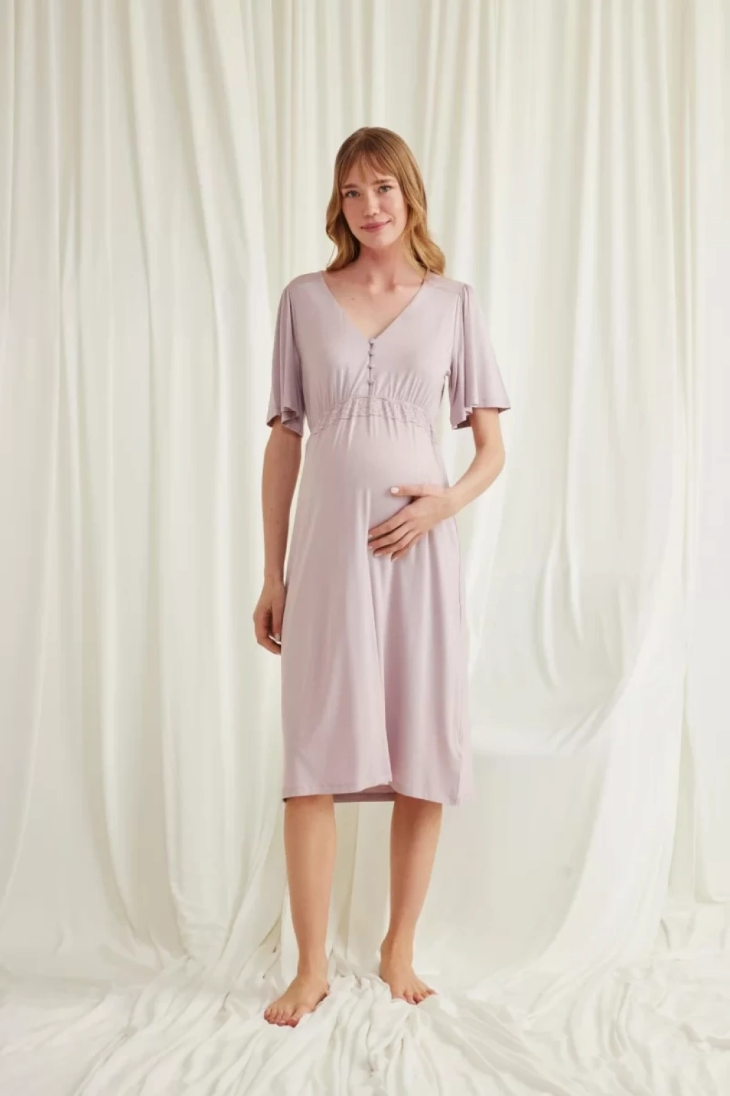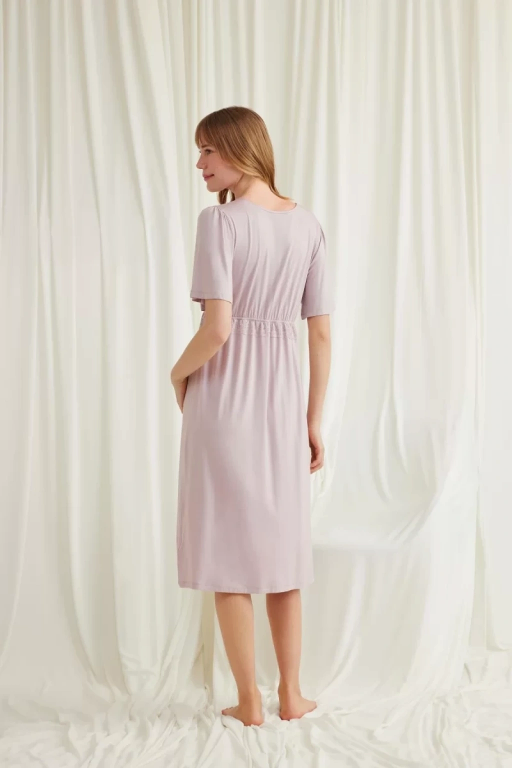Gecelik: Vizon renklidir, V yakalıdır, kolu ve beli dantellidir, yakasının altı düğmelidir, emzirme için düğmelerden açılır durumdadır, kısa kolludur, örme kumaştır.