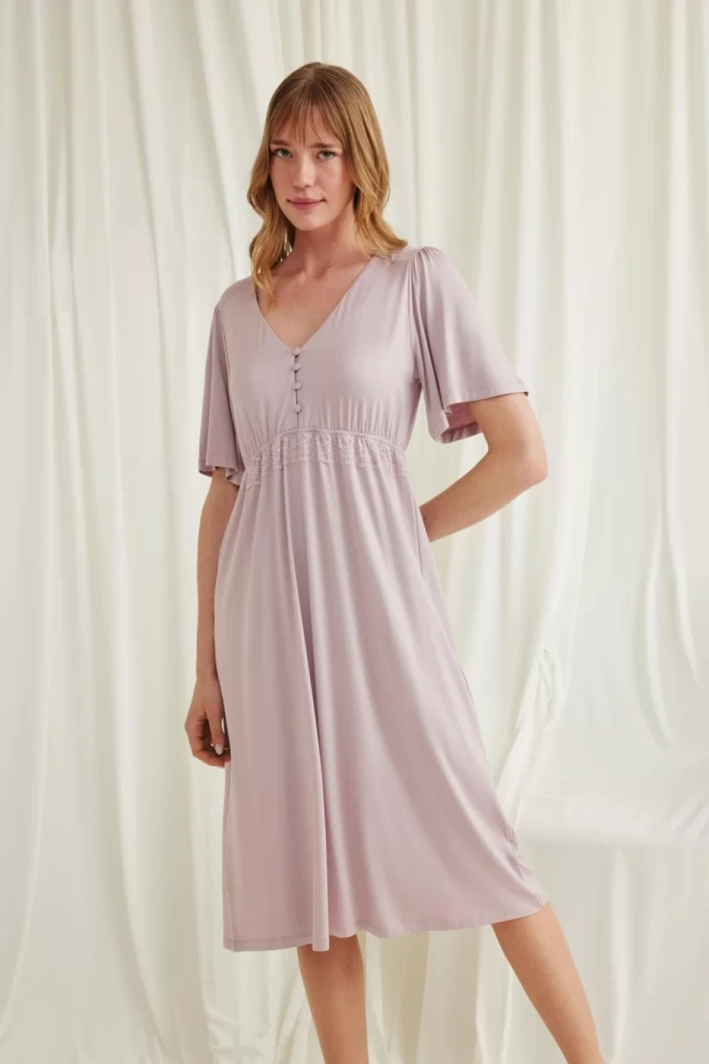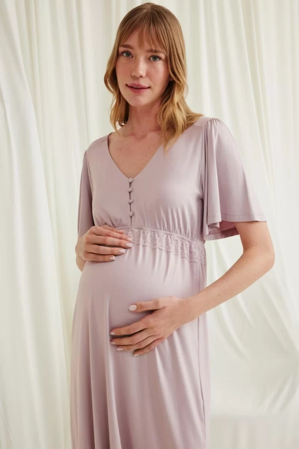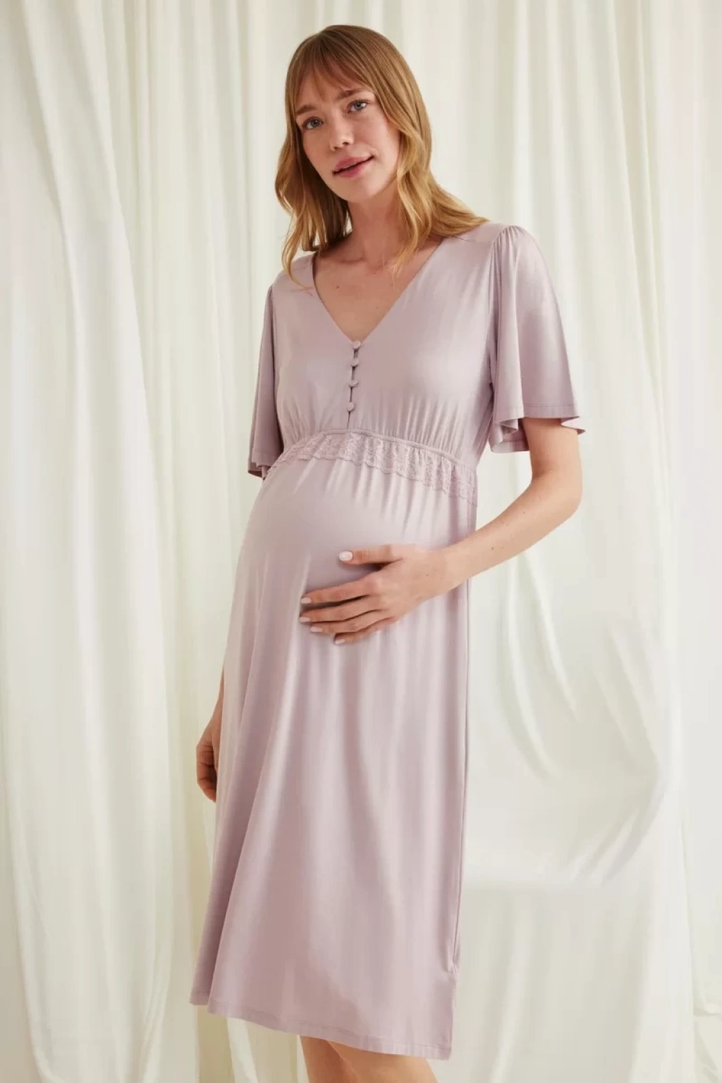 Gecelik: Vizon renklidir, V yakalıdır, kolu ve beli dantellidir, yakasının altı düğmelidir, emzirme için düğmelerden açılır durumdadır, kısa kolludur, örme kumaştır.