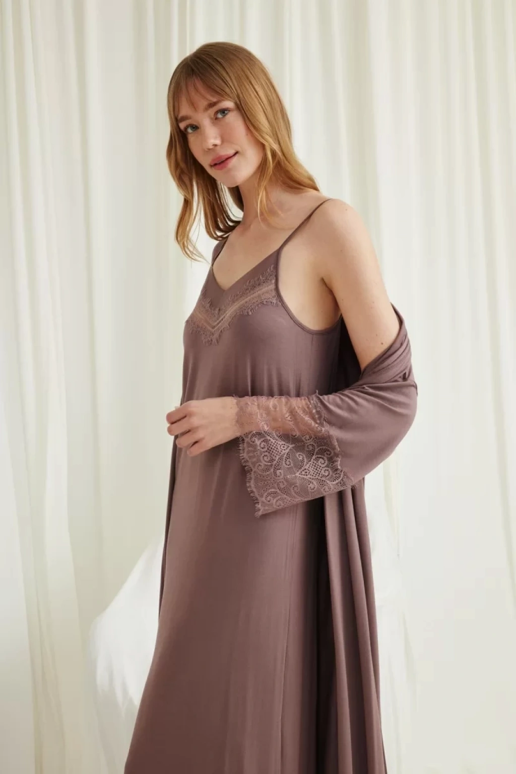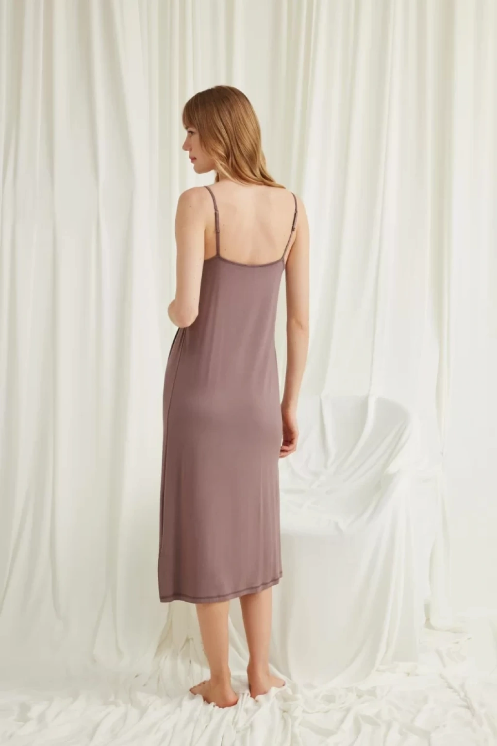 Gecelik: Kahverengi renklidir, ayarlanabilir ip askılıdır, derin V yaka dekoltelidir, göğüs kısmı dantellidir, örme kumaştır.