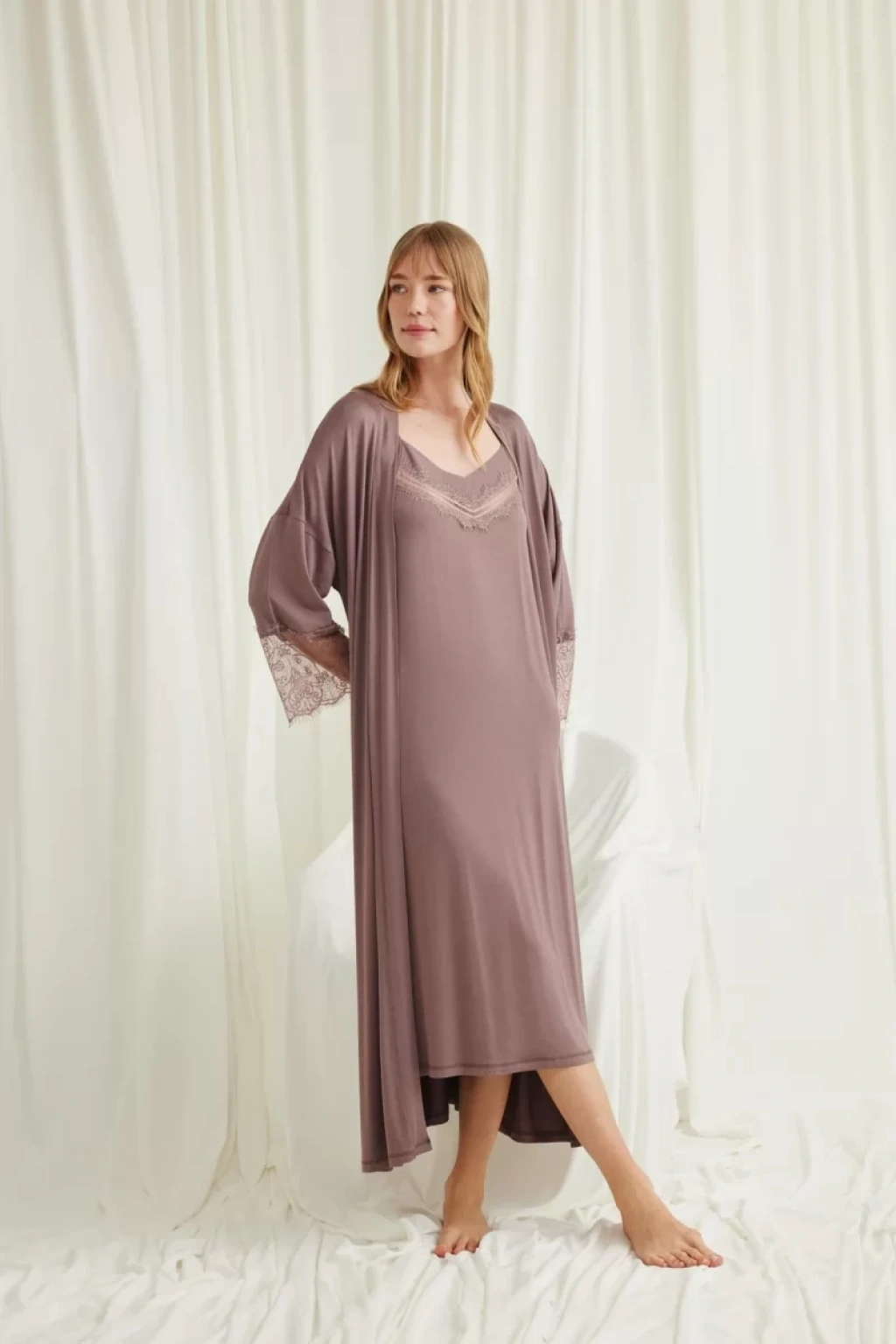 Dekolteli Yakası Ve Kolu Dantelli Sabahlık Takımı
