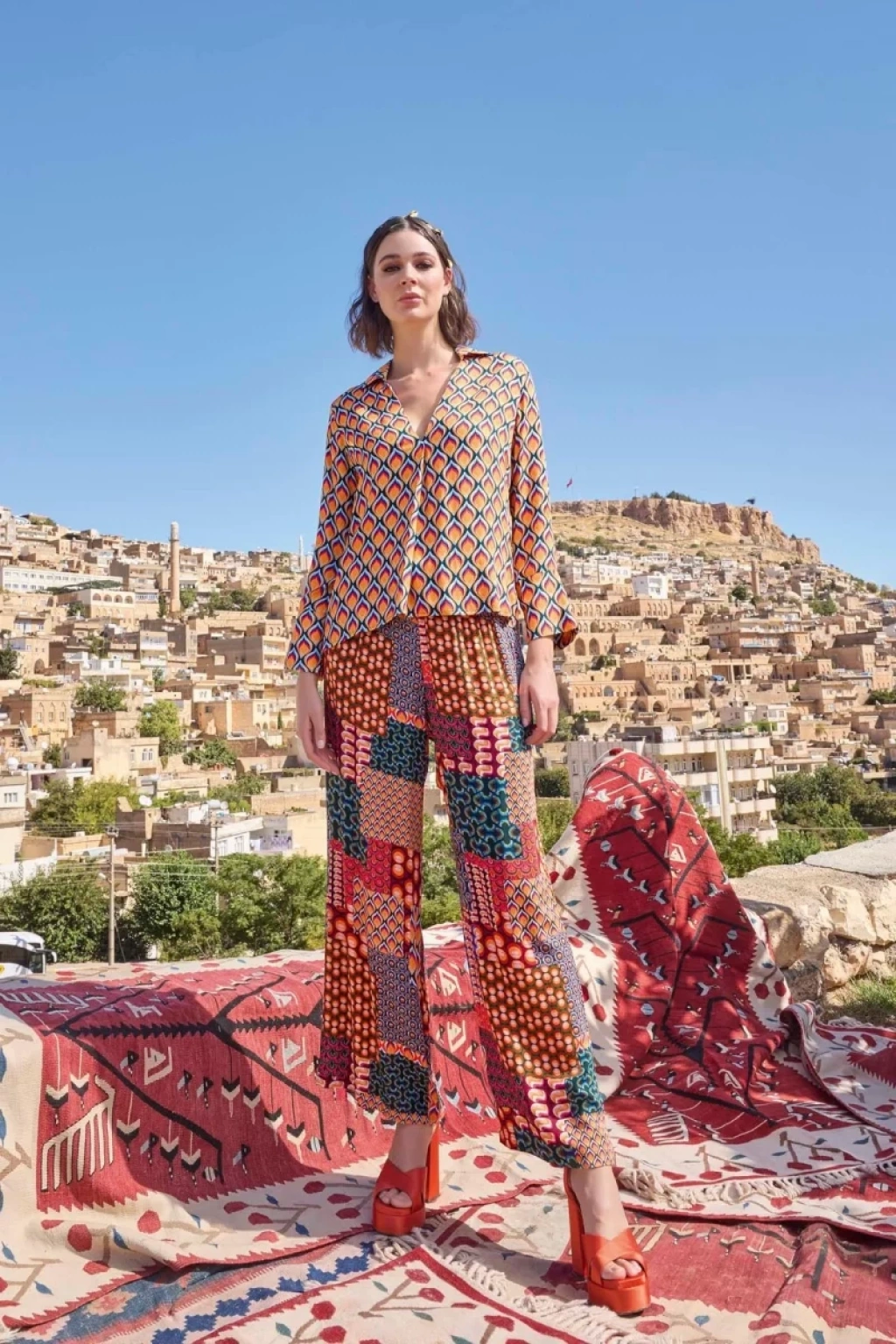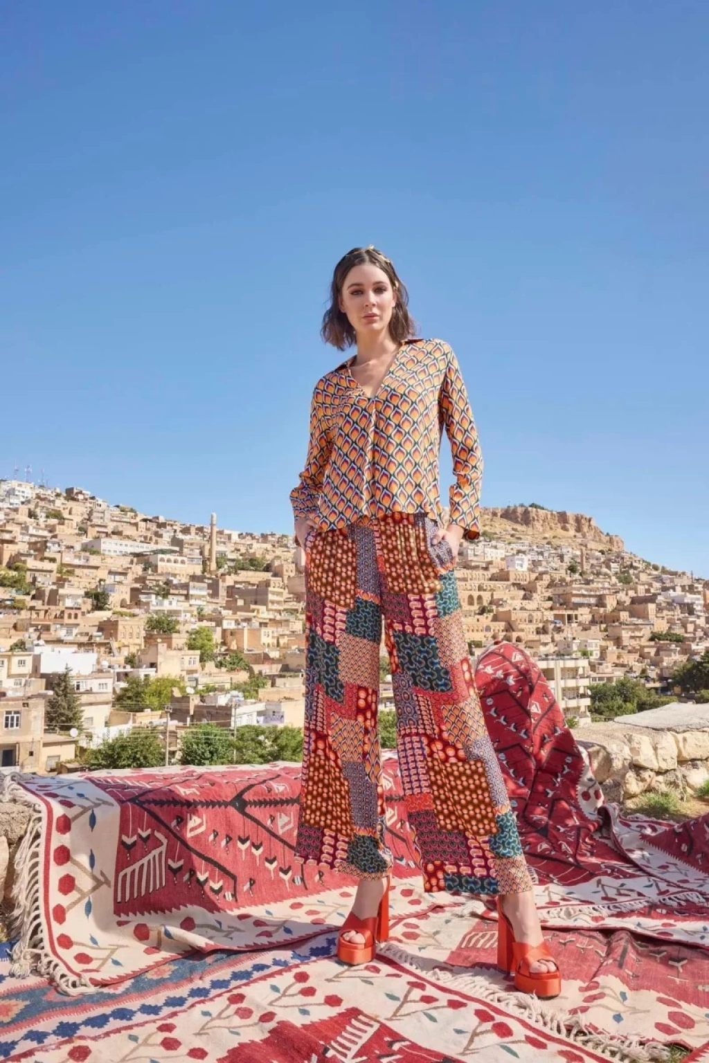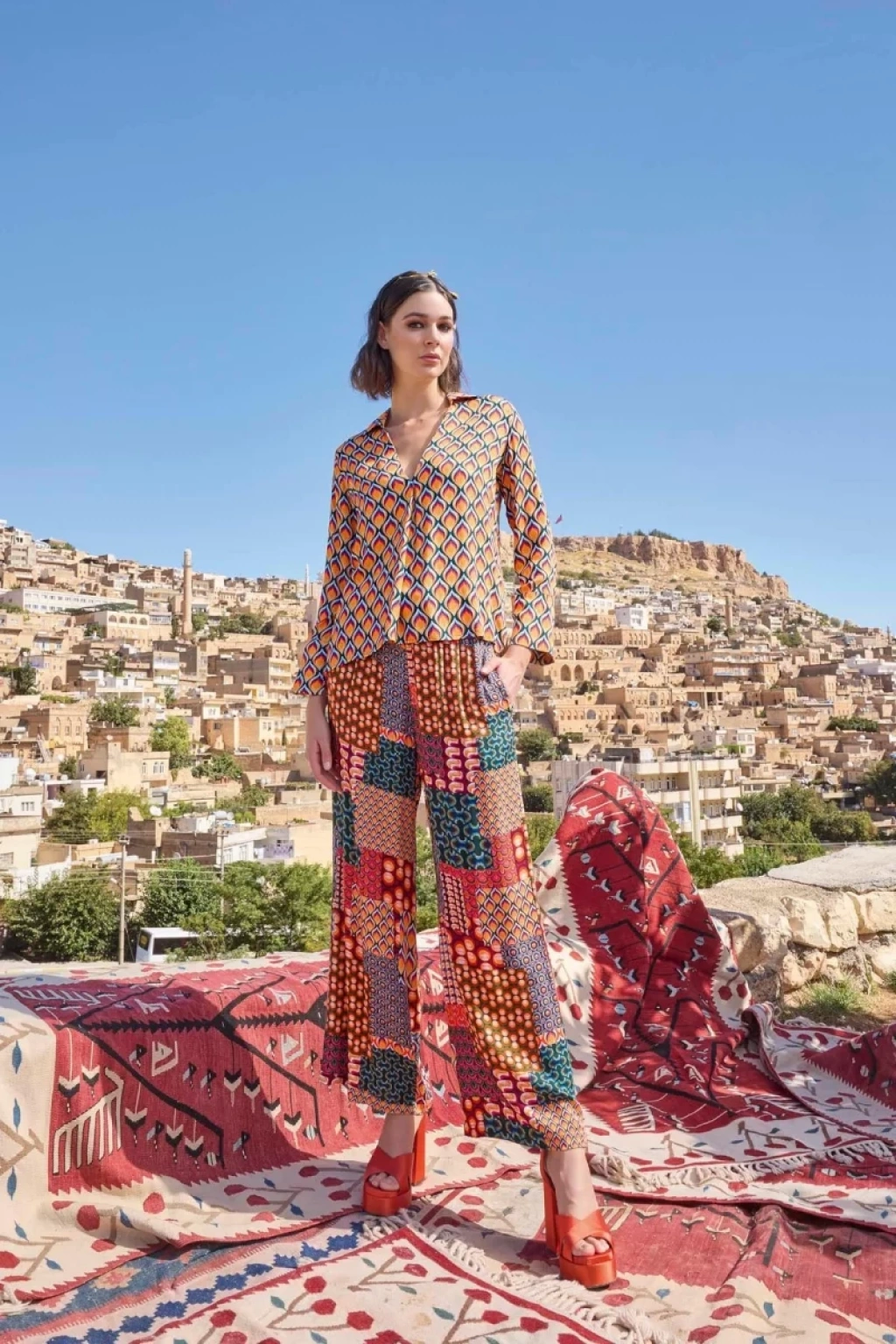 Üst: Etnik desenlidir, gömlek yakalıdır, uzun kolludur, dokuma kumaştır.Alt: Etnik desenlidir, ceplidir, dokuma kumaştır.Materyal%100 Viskon