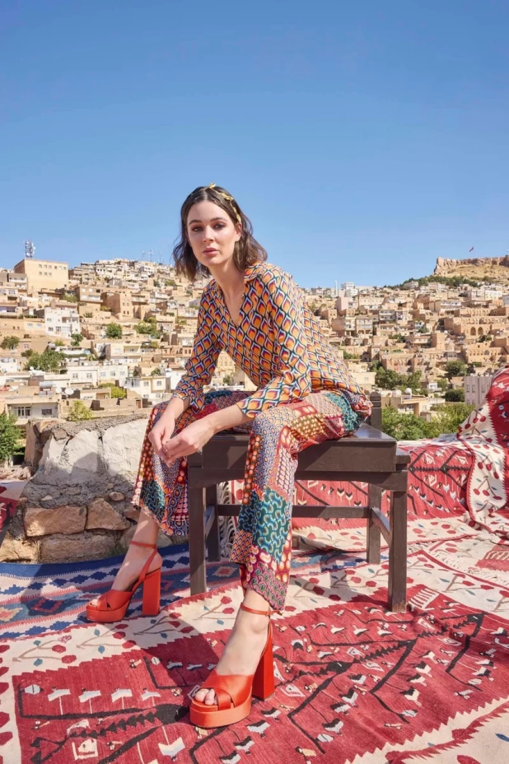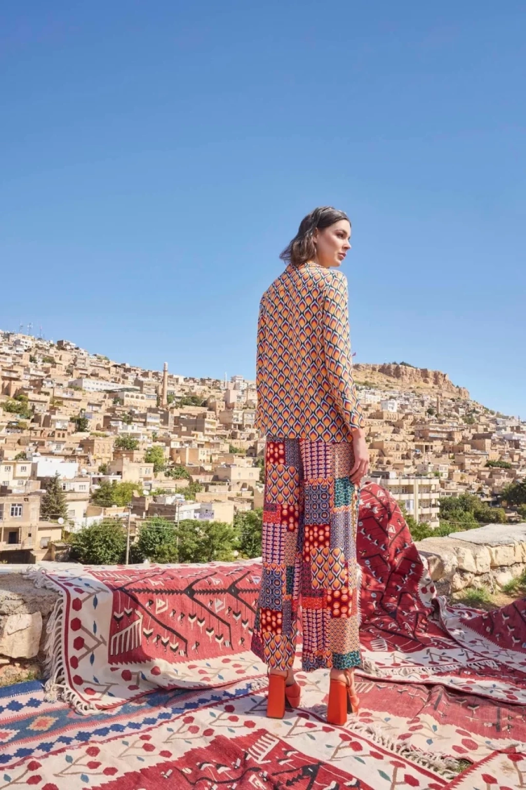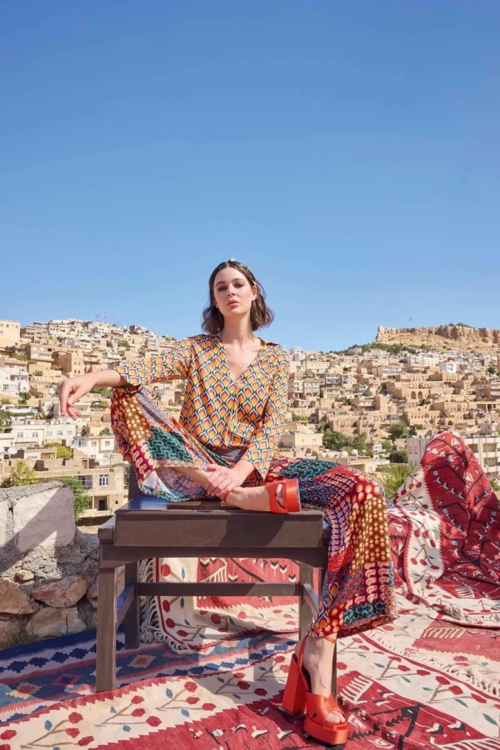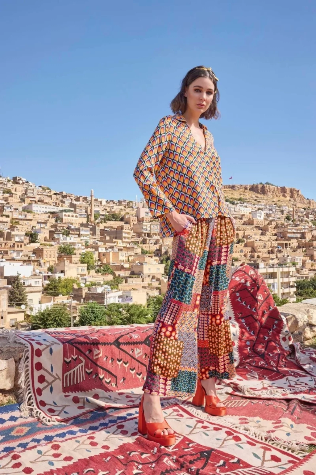 Üst: Etnik desenlidir, gömlek yakalıdır, uzun kolludur, dokuma kumaştır.Alt: Etnik desenlidir, ceplidir, dokuma kumaştır.Materyal%100 Viskon