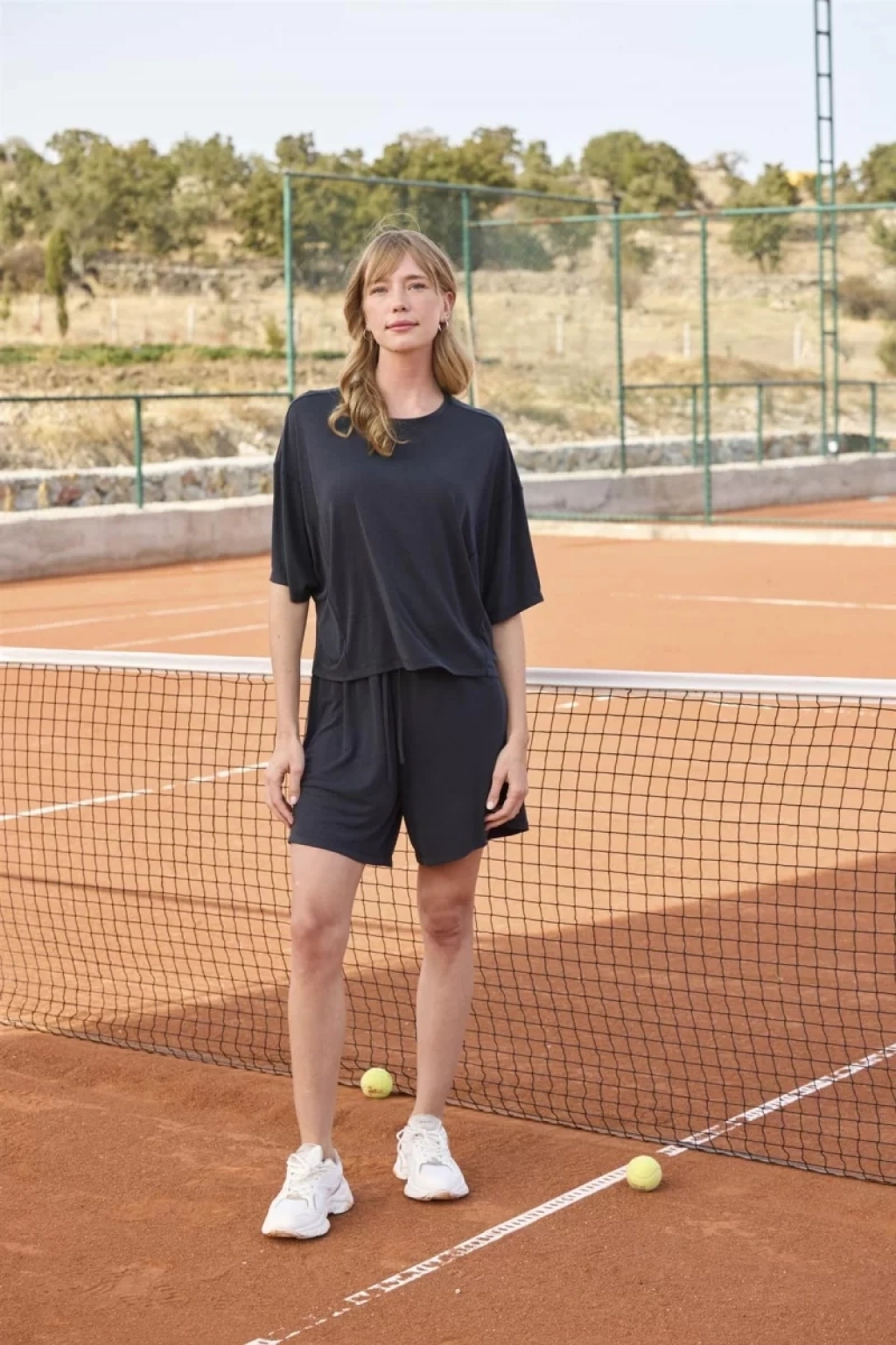 Üst: Antrasit renklidir, bisiklet yakalıdır, kısa kolludur, örme kumaştır.