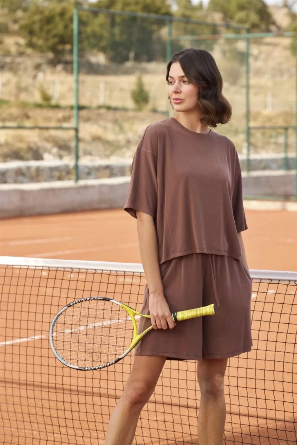 Üst: Kahverengi renklidir, bisiklet yakalıdır, kısa kolludur, örme kumaştır.