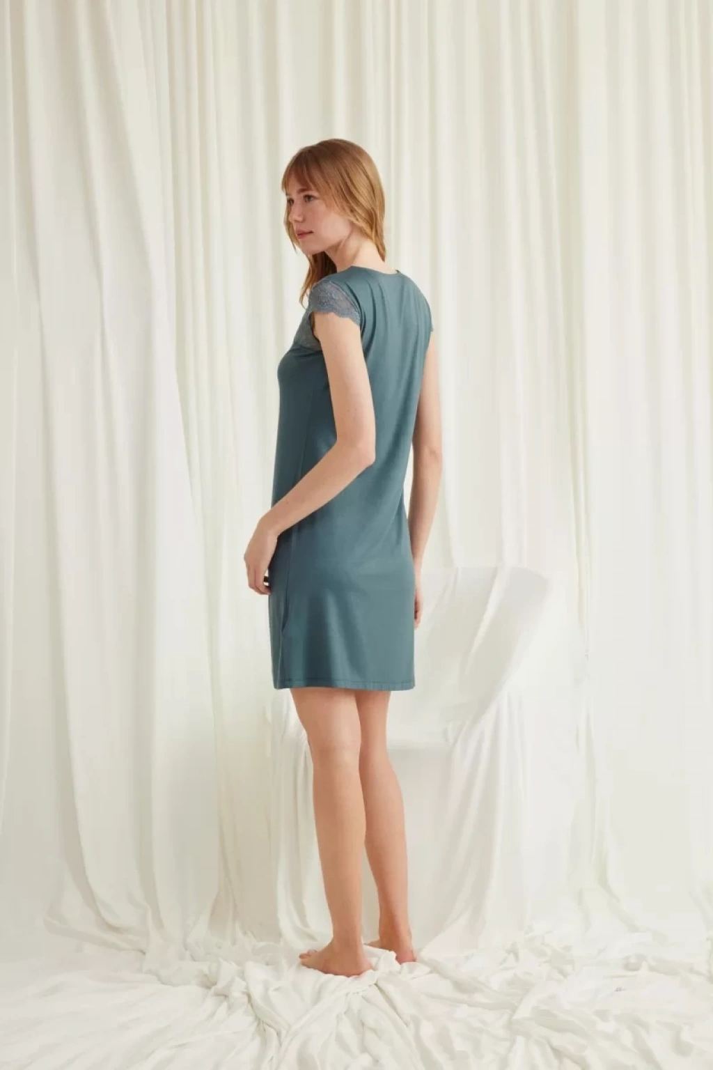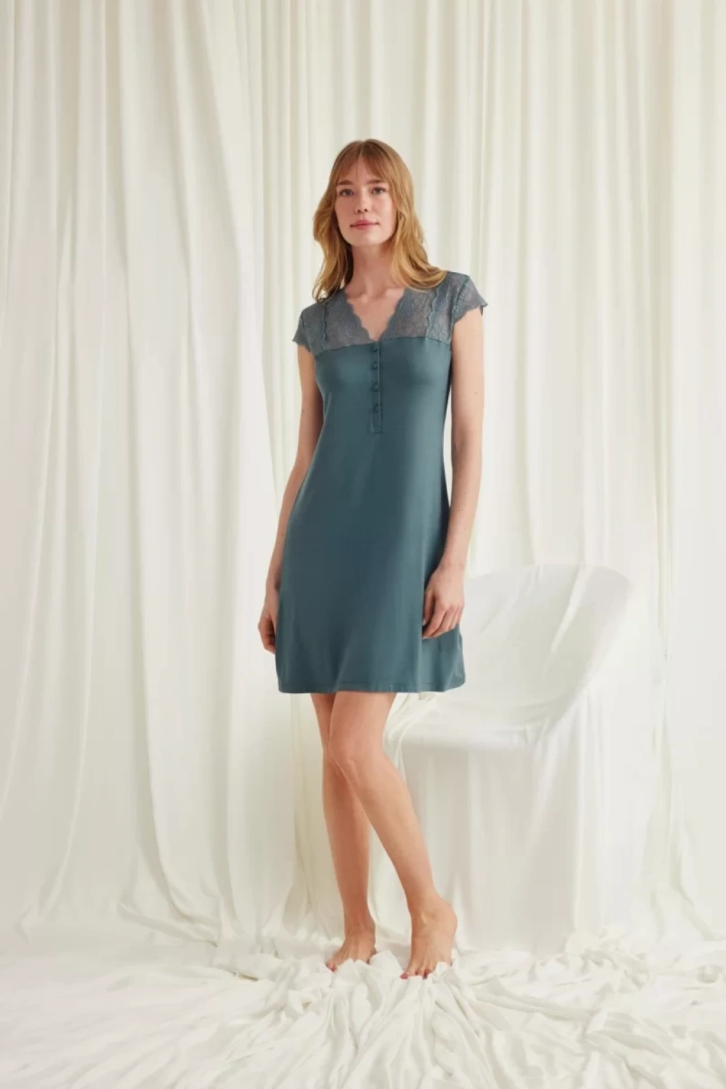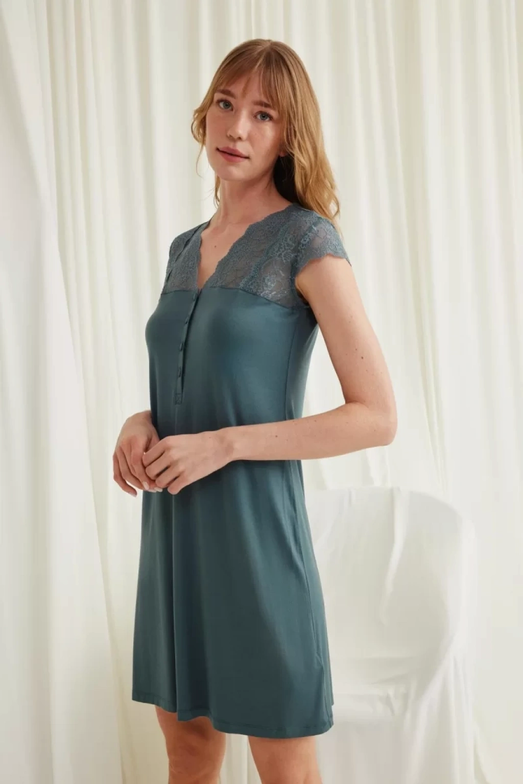 Gecelik: Yeşil renklidir, V yakalıdır, kolu, omzu ve yakası dantellidir, yakasının altı düğmelidir, kısa kolludur, örme kumaştır.