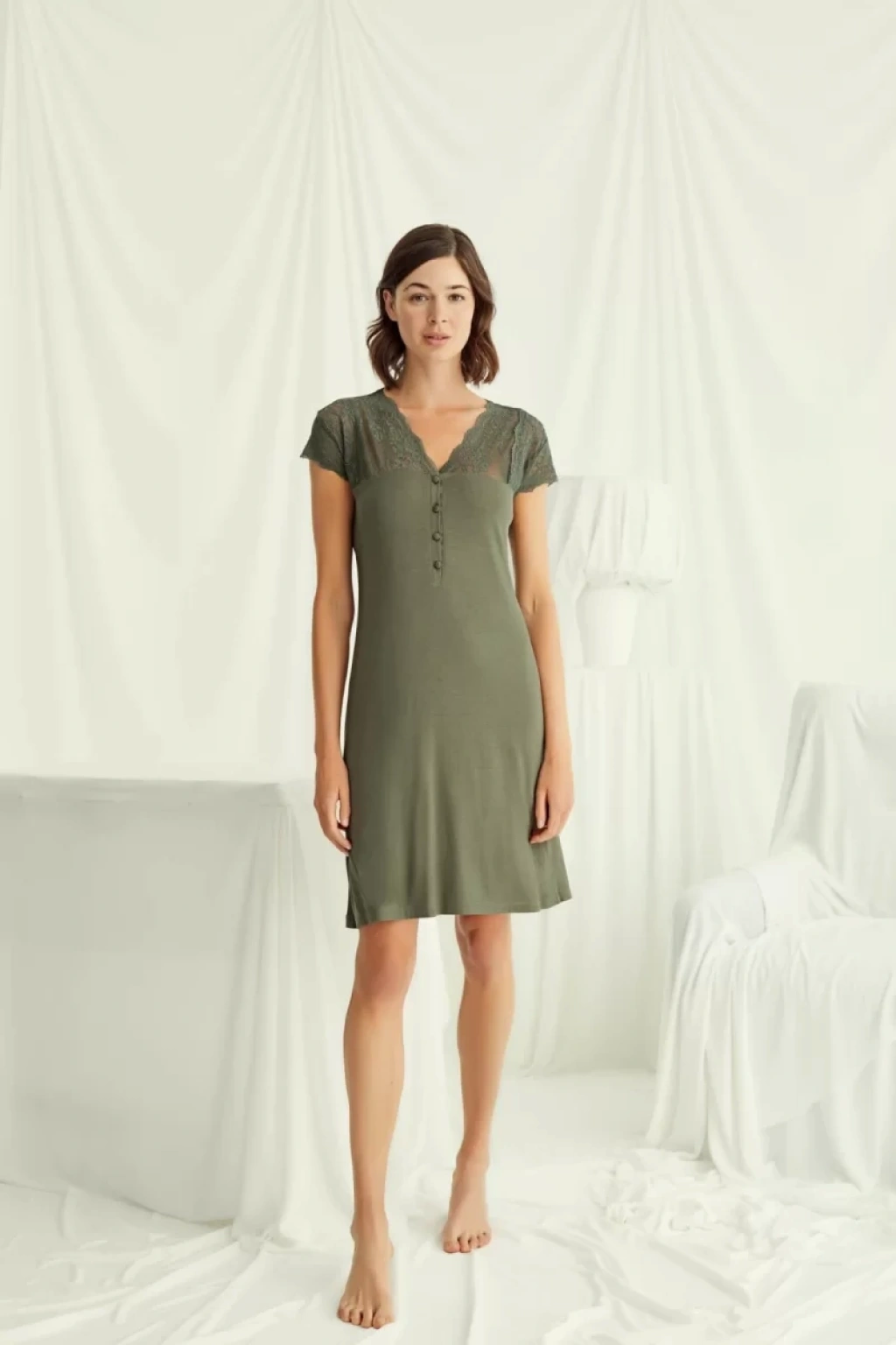 Gecelik: Haki renklidir, V yakalıdır, kısa kolludur, kolu ve omzu göğüs hizasına kadar dantellidir, yakasının altı düğmelidir, örme kumaştır.Materyal%94 Viskon %6 Elastan