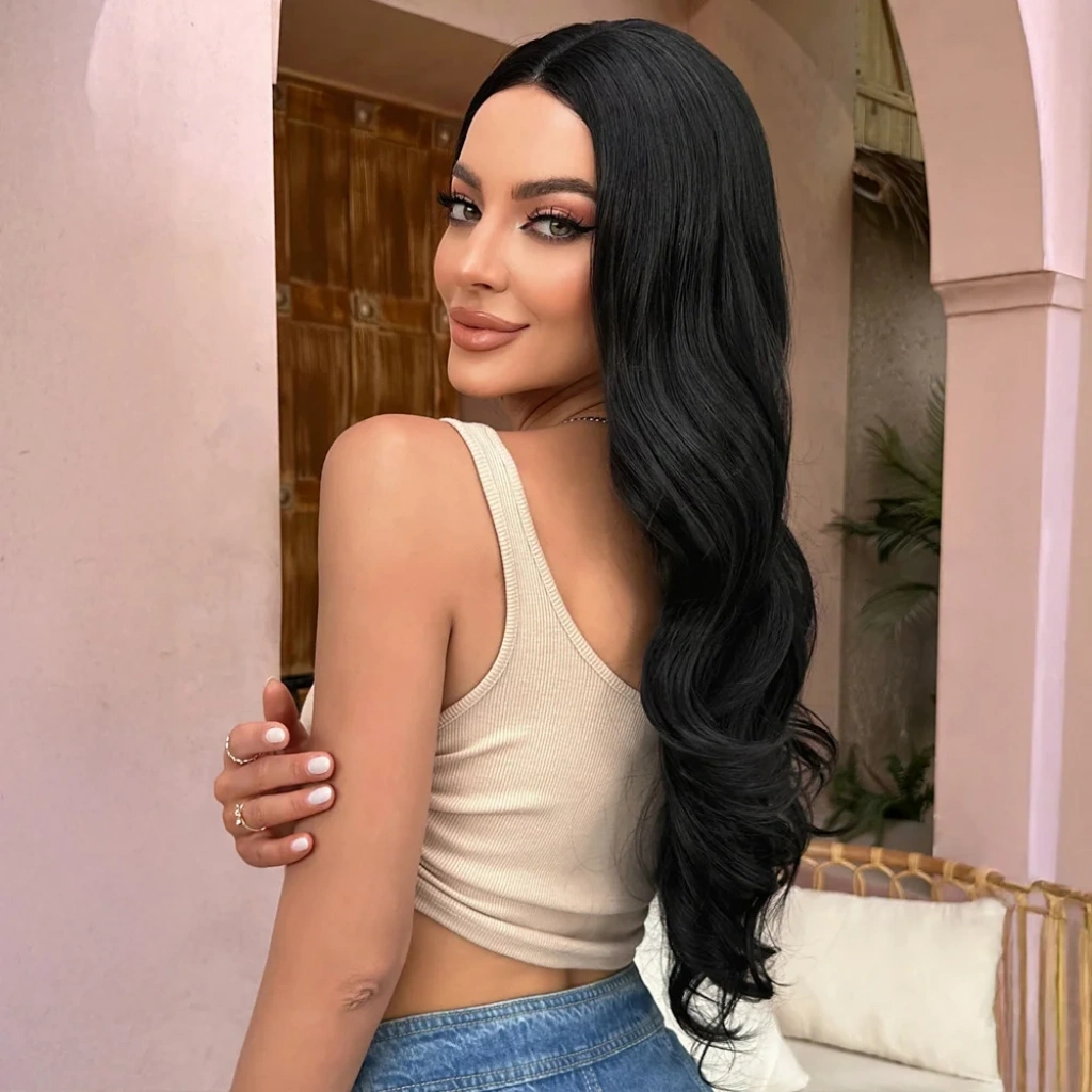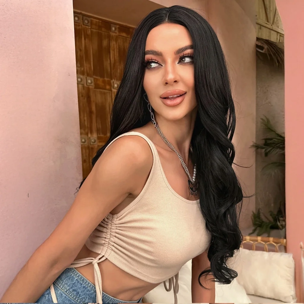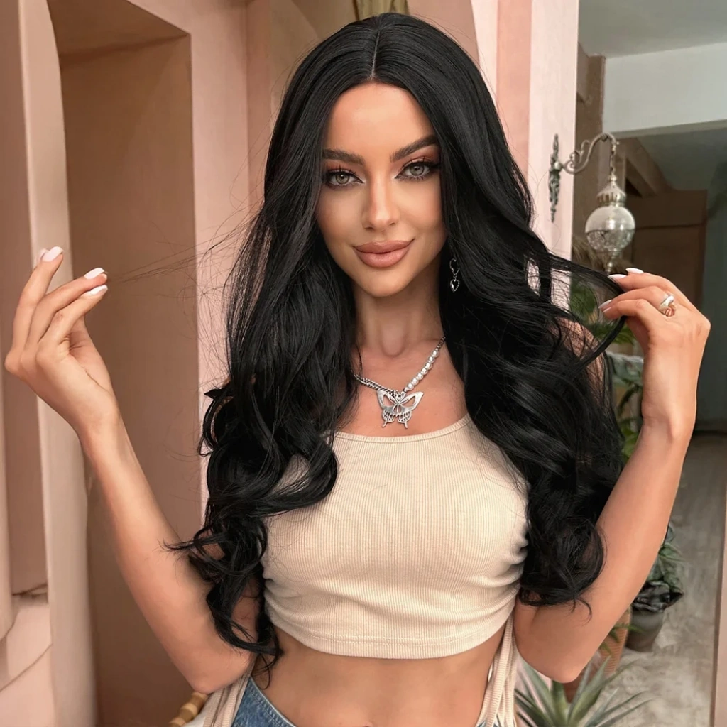 Koyu Siyah Su Dalgalı Fiber Sentetik Tül Peruk